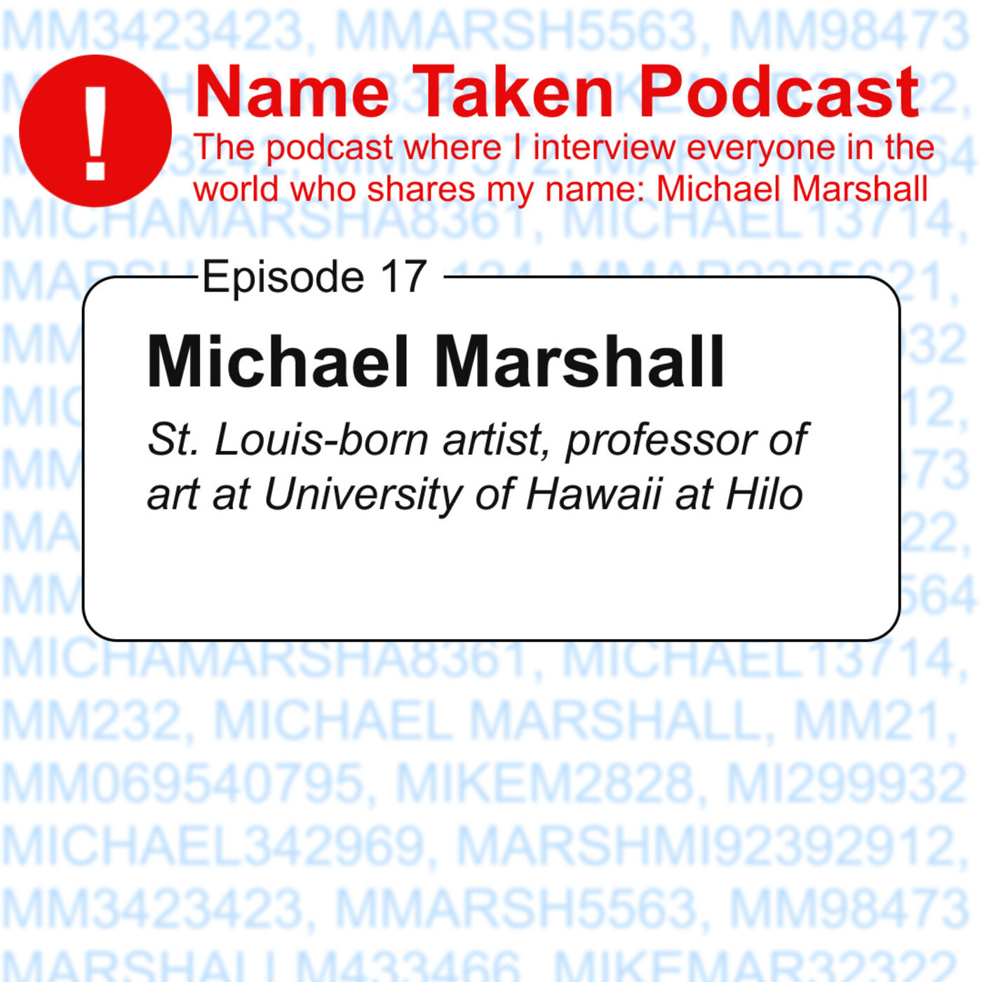 According to the US Census records there are at least 2900 Americans that share my full name (Michael Marshall). Unsurprisingly there are many more across the greater English-speaking world. So, I decided to set out and interview the other Michael Marshalls to see what they're all like. Why not right? And it's actually been a riot. Michael Marshalls are rad! Among us are authors, pro athletes, activists, journalists, artists, really cool dads, architects, carpenters, inventors, actors and so much more. Each week I speak to a different Michael Marshall about their own experiences as well as their shared experience of our name. -