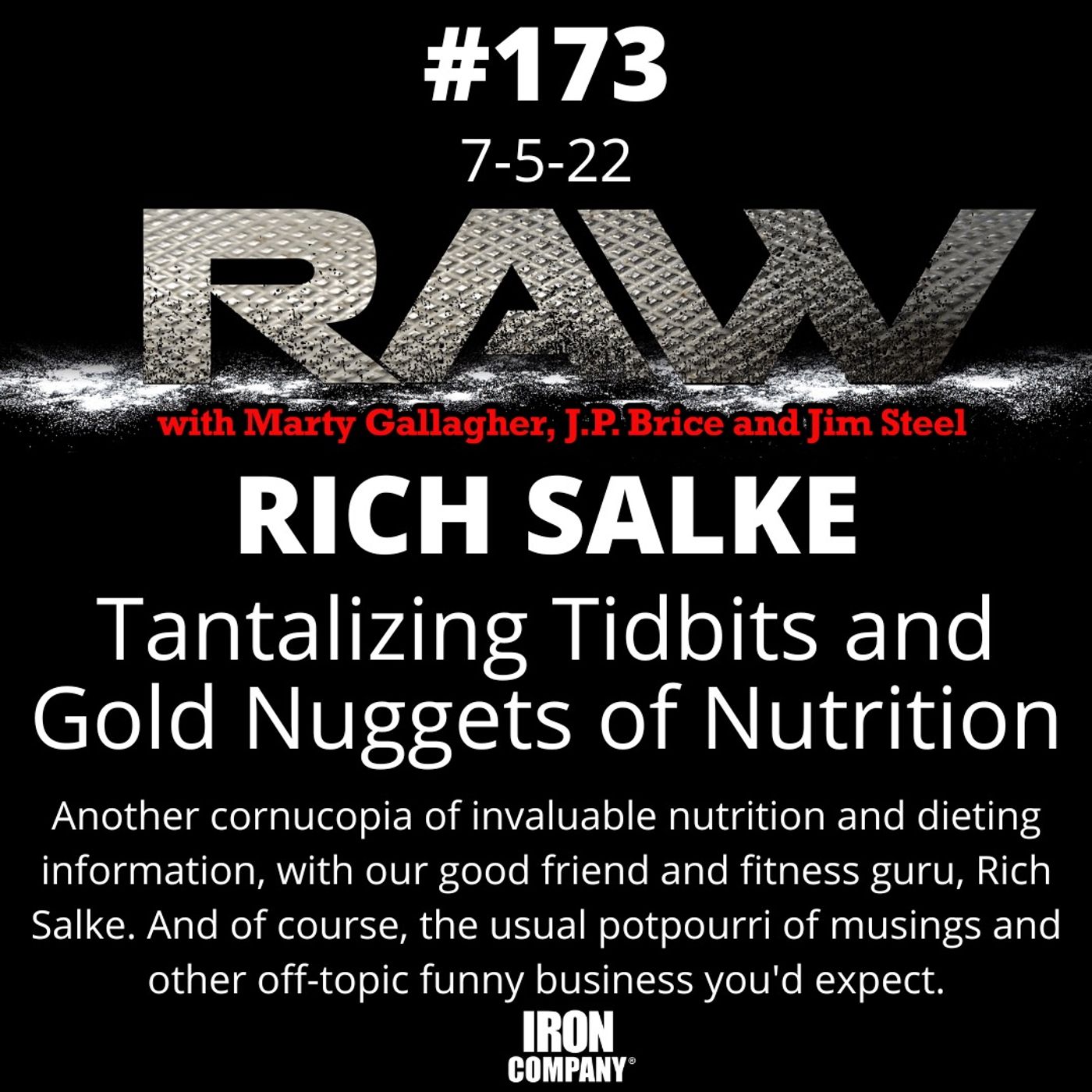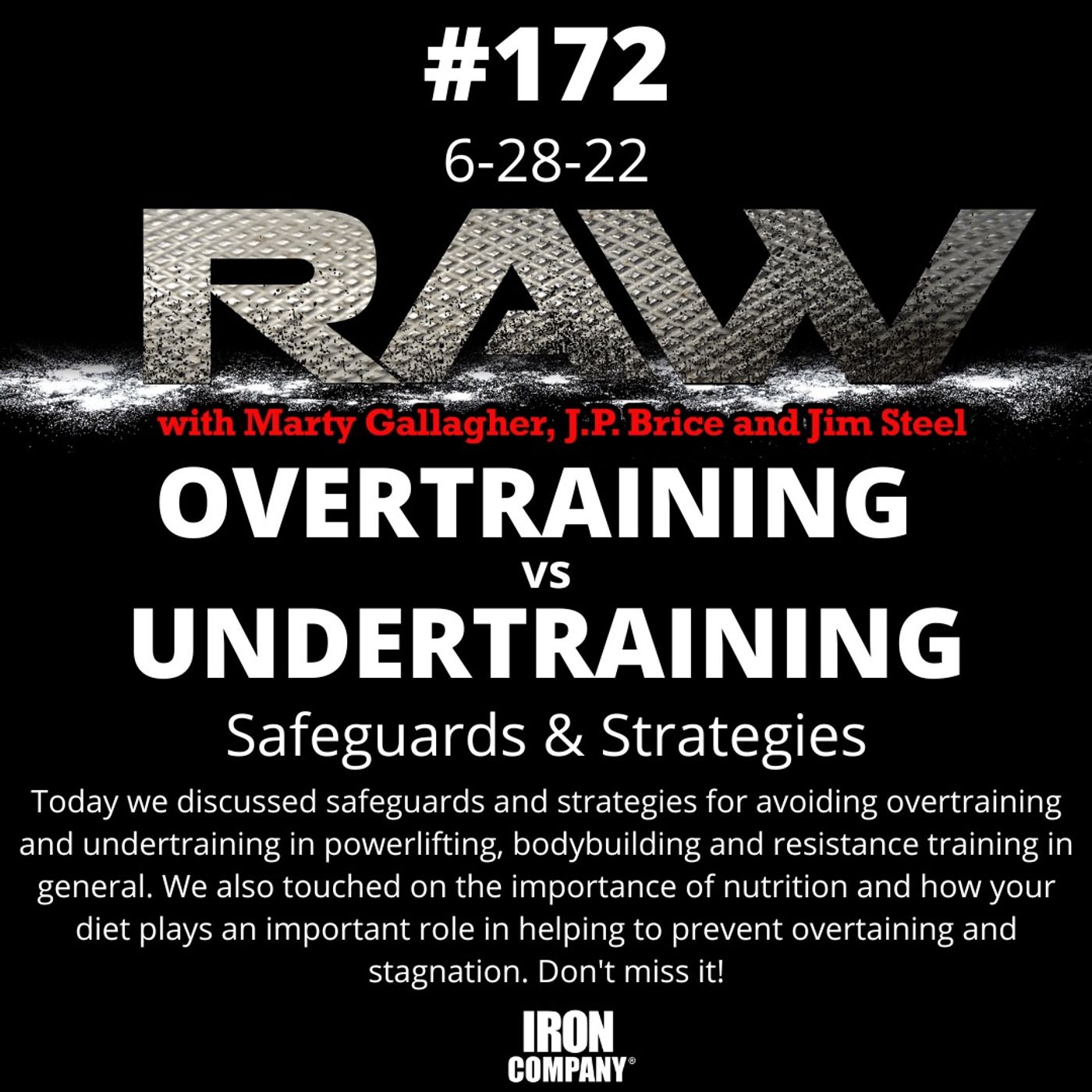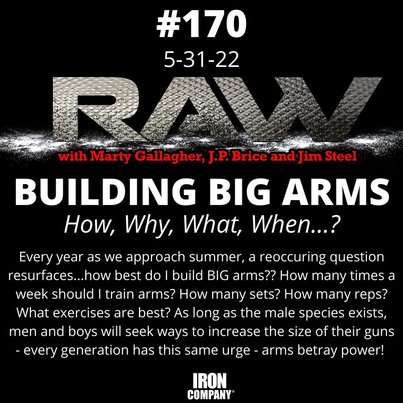 The RAW Podcast is packed with insightful, results producing information for powerlifting, bodybuilding, sports training and general health and wellness. We obtain dramatic results for regular people using elite methodology; simplistic sophistication, maximum results for minimum time investment. Your fitness efforts have failed or been stymied by fragmentation, i.e. the elite understand that a subtle balance between exercise and nutrition need be struck and maintained. Faulty methods doom your efforts before they start. Each week legendary hardcore strength coach Marty Gallagher, Jim Steel and moderator J.P. Brice turn their 100+ years of cumulative experience to some aspect of the transformative equation. Learn how to integrate proven-effective nutrition and hardcore exercise strategies into your lifestyle. RAW is brought to you by https://www.ironcompany.com © 2017-2022 IRON COMPANY Check out the RAW with Marty Gallagher weekly column at IRON COMPANY® https://www.ironcompany.com/blog/category/raw and Strength Training Equipment https://www.ironcompany.com/strength-training-equipment -